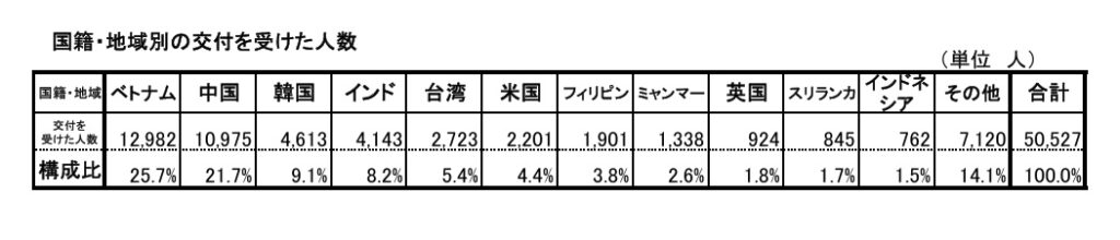 令和元年において、専門的な技術や知識等を活用して日本企業等への就職を目的とした「技術・人文知識・国際業務」の在留資格認定証明書の交付を受けた外国人は 50,527人 で、前年から 21.7%増加 しています。