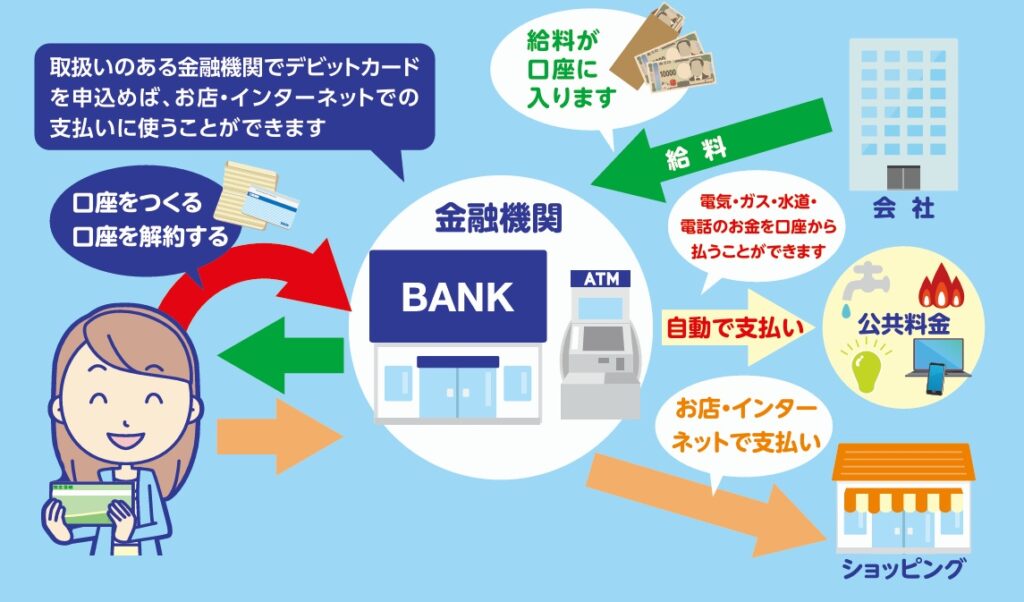 日本で暮らすとき、銀行口座があるととても便利です。給料の受け取り、公共料金の支払い、買い物などに使えます。口座をつくるときは、必要な書類や印章(またはサイン)を準備し、住所や在留資格が変わったらすぐに銀行に知らせましょう。海外送金は銀行によって条件が異なります。帰国時は口座を必ず解約し、他人に渡すことは絶対にしてはいけません。わからないことは、銀行や所属先に相談してください。